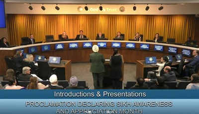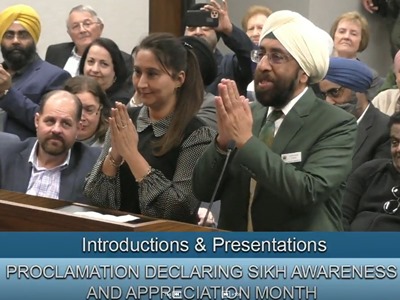 Commissioner Shivinderjit Singh and Dr. Ginny Kaur shared insights into Sikh culture, history, and values with the audience and were invited by the Mayor to accept the Proclamation on behalf of the local Sikh Community.