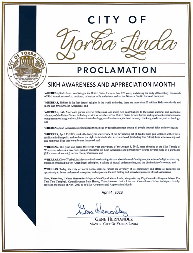 The proclamation of Sikh Awareness and Appreciation Month by Mayor Gene Hernandez is a significant milestone for the Sikh community in Yorba Linda, highlighting the city's commitment to diversity, inclusivity, and mutual respect. The Sikh community expresses heartfelt appreciation to the Mayor, the City Council and the City Staff for their immense support and looks forward to continued collaboration in promoting understanding and appreciation of Sikh culture in the city and beyond.