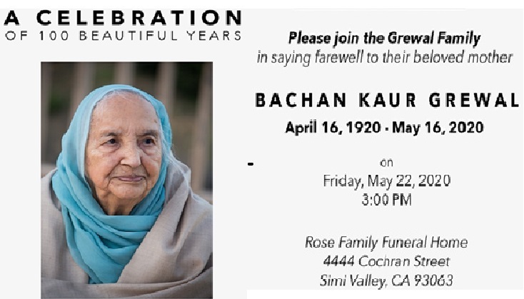 We regret to inform you that our dear mother, 'Bachan Kaur Grewal', passed away today on May 16, 2020. She has lived 100(+1 month) healthy and happy years and we are blessed to have shared them with her.
