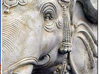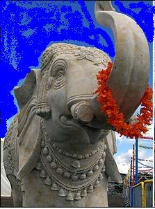 Two elephants made of fibreglass stand at the Shri Venkateswara