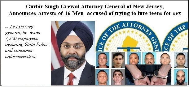 NRI GREWAL Attorney General of New Jersey, Announces Arrests of 16 Men accused of trying to lure teens for sex