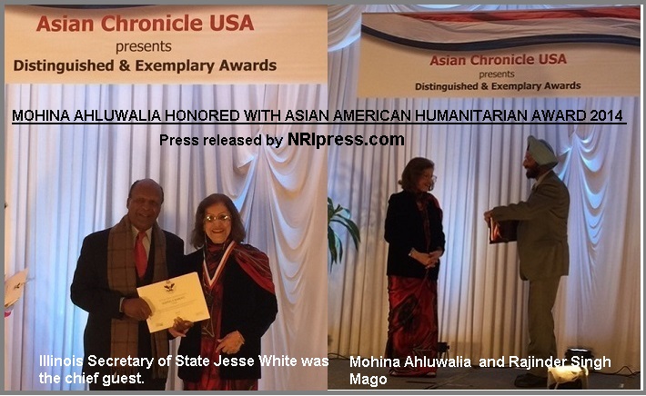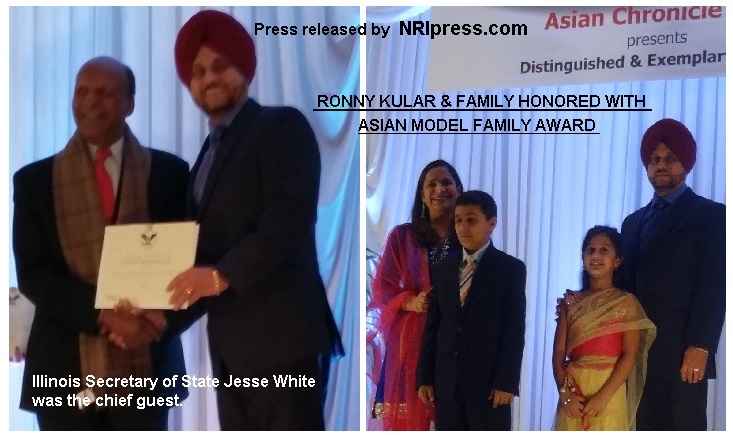 Mrs. Mohina Ahluwalia of Chicago was awarded the Asian Humanitarian 2014, and the Kular family of Burr Ridge Illinois, Ronny Singh Kular and Dr. Rajnish Kaur Kular and their children Kermen Singh and Avneet Kaur were honored as the Asian American Model Family. The awards were presented by Asian Chronicle USA TV Channel Program. Illinois Secretary of State Jesse White was the chief guest