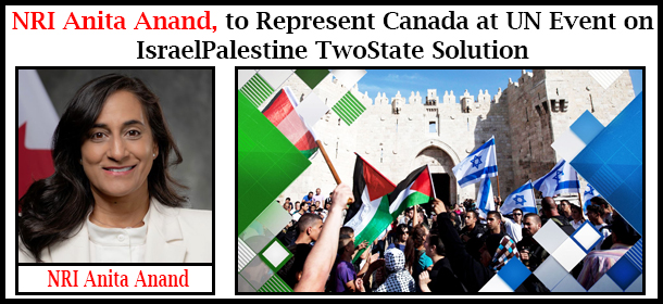 NRI Anita Anand, Foreign Affairs Minister Canada, will represent Ottawa at the high-level United Nations Conference on the Peaceful Settlement of the Question of Palestine and Implementation of the Two-State Solution, held from July 28–30, 2025 at UN Headquarters in New York.