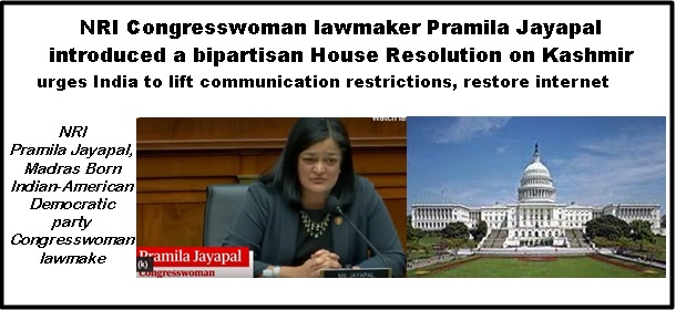 NRI Pramila Jayapal, Madras Born Indian-American Democratic party Congresswoman lawmaker, introduced a resolution on Kashmir in the House of Representatives to raise their voices against the Indian government’s move on Jammu and Kashmir and urges India to lift communication restrictions, restore internet.
