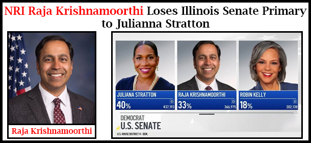 NRI Raja Krishnamoorthi, Congressman, has lost the Democratic primary race for the U.S. Senate seat in Illinois to Lieutenant Governor Julianna Stratton. The closely watched contest drew significant attention as both candidates campaigned on issues including economic growth, healthcare, and social justice.