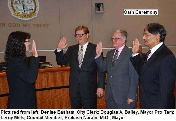 Cypress Mayor Dr. Prakash Narain, Mayor Pro Tem Douglas Bailey, and Councilmember Leroy Mills were installed to serve their second four-year term on the Cypress City Council. An oath ceremony was held at the November 22, 2010 City Council meeting.
