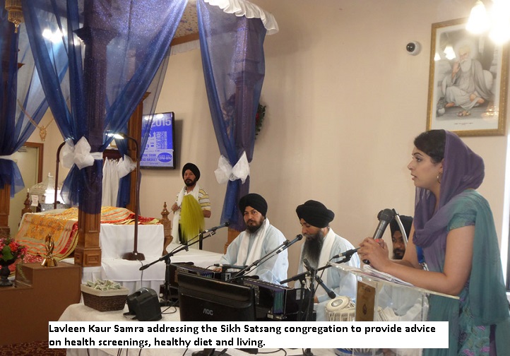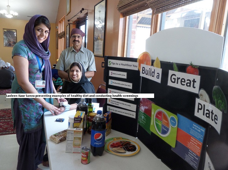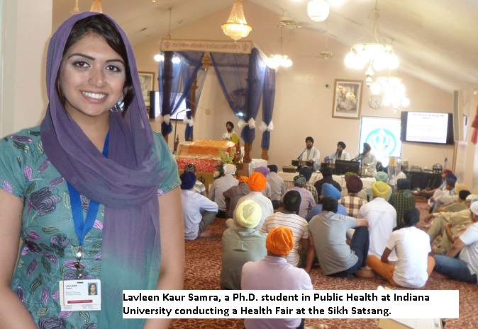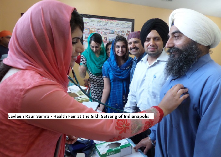 Miss Lavleen Kaur Samra, a Ph.D. candidate at Indiana University, is leading this effort. Lavleen is pursuing her research in Health Behavior and Preventive Medicine. With charts, graphs, and diagnostic equipment, Lavleen has been visiting Sikh Gurdwaras in central Indiana, addressing congregations, distributing health-related literature and healthy choice advice regarding food, diet, nutrition, and do’s and don’ts for healthy, disease-free life choices. Lavleen is passionate, articulate, understands her audience, addresses them in Punjabi, and knows how to win trust in her cause, which she hopes will be their cause and a catalyst for change. Lavleen is frank and persuasive in bringing home the dangers of alcohol, sweets loaded with sugar, food preparations floating in cooking oil. She offers alternatives and cautions moderation. Suddenly, we are learning about healthy food and sensible diet changes that can prevent many devastating diseases: diabetes, high blood pressure, heart disease, cancer, liver disease, and a host of other health challenges.