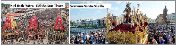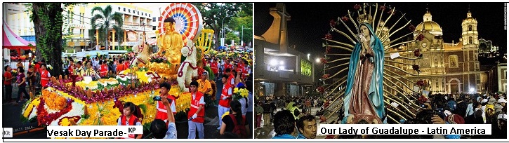 High holy day processions, commemorative parades, and celebrations are a centuries-old traditions in many cultures and faith communities: Day of the Virgin of Guadalupe in Mexico; Vesak Day - "Buddha's Birthday" is a celebration of the birth, enlightenment, and death of Buddha in Thailand; Semana Santa - Holy Week in Spain; Ratha Yatra or Chariot Festival- originated in Puri, Odisha, India. These parades often take on a unique aura and myriad expressions as major community happenings of local and national significance and as international and interfaith attractions.
