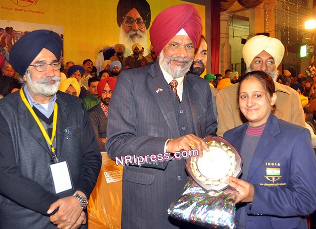 Mr. Surjit Singh Rakhra, Rural Development and Panchayat Minister honoring Gymnast Meenakhsi at YPS Stadium Patiala during 3rd World Cup Kabbadi 2012