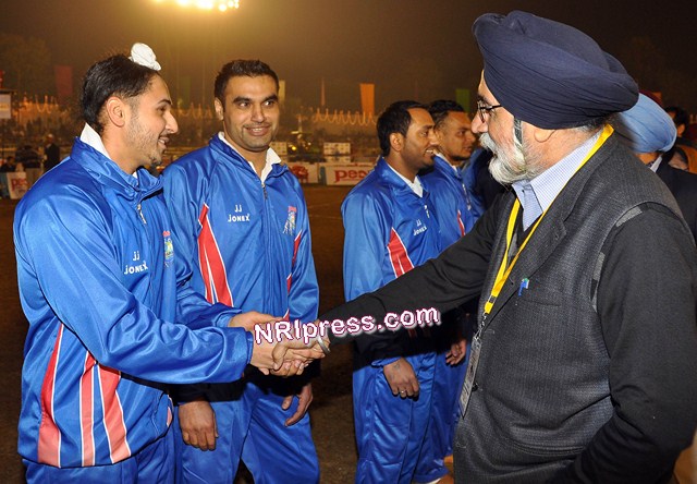 Mr. Surjit Singh Rakhra, Rural Development and panchayat Minister along with Mr. Sikander Singh Maluka, Education Minister and Mr. Balwinder Singh Bhunder, MP interacting with Denmark Team (Red Dress) and England (Blue Dress) at YPS Stadium Patiala during 3rd World Cup Kabbadi 2012