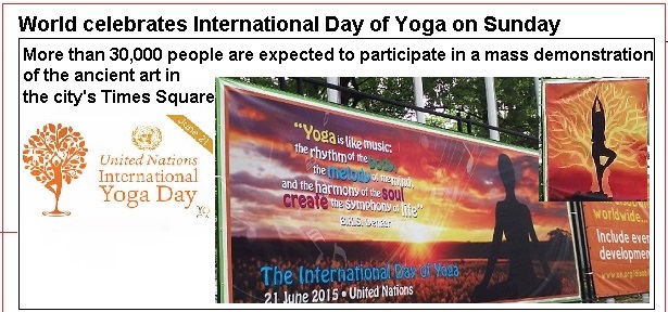 New York, June 17, 2015: As the world celebrates International Day of Yoga on Sunday in a unique event that is in many ways an endorsement of the Indian way of life, more than 30,000 people are expected to participate in a mass demonstration of the ancient art in the city's Times Square after global leaders and diplomats from around the world launch the observance at the UN headquarters.